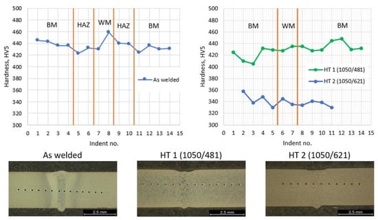 In the as-welded condition, the hardness was similar in each area of the joint and ranged between 425 and 460 HV5. The lack of significant changes in the HAZ indicates that the amount of heat input into the material did not cause significant changes in the HAZ that could result in the loss of (decrease) mechanical properties.