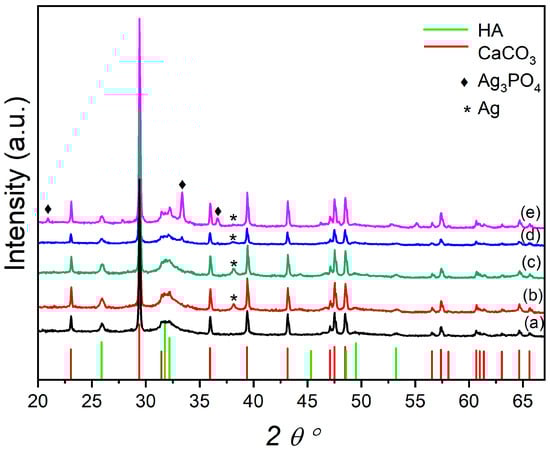 XRD pattern of OMP (a) compared with the OMP@silver composites: US50B (b), US100B (c), US50C (d), and US100C (e). Pattern lines: CaCO3 (COD ID: 9015390), red lines; HA (COD ID: 9011097), green lines; Ag3PO4 (COD ID: 2106404), ◆; Ag (COD ID: 9008459) *.