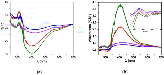 UV–Vis reflectance (a) and absorption (b) spectra (in Kubelka–Munk units) of US50B (red line), US100B (green line), US50C (blue line), and US100C (pink line); Inset first derivative of the absorption spectrum.