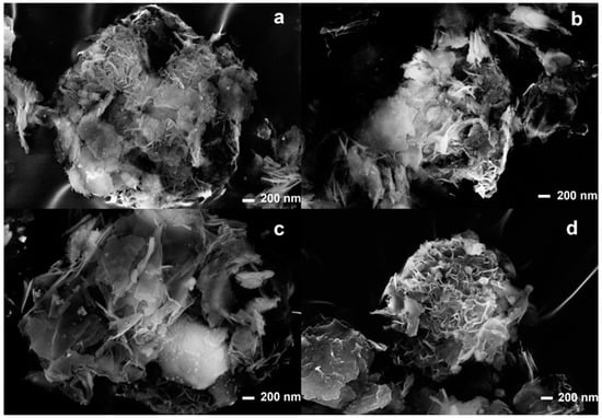 Morphological characterizations were carried out using SEM-EDX and TEM analyses. Figure 3 shows the SEM analyses of the composites. It is possible to observe that in all composites, the lamellar meshwork structure remains unchanged after the ultrasound treatment.
