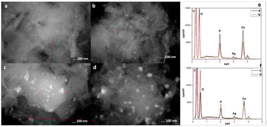 Implant-associated infections are a significant clinical problem and have a huge impact regarding morbidity, mortality, and medical public costs [40]. If an implant infection occurs, long-term antibiotic therapy, which is systemically administered, is usually necessary but not always with a positive onset because of the diffusion of antibiotic resistance. In the cases of more severe infections, invasive surgery is required for surgical debridement of the affected tissue, and, in the worst cases, the complete removal of the implant could be necessary. One of the proposed strategies to prevent this problem is the use of composites of HA and silver [41,42,43,44,45,46,47,48]. The main methods proposed to obtain HA and silver biomaterials were reviewed by Guo et al. [49]. They consist of doping HA with silver during its preparation [50,51,52,53], the adsorption or deposition of silver nanoparticles that have been previously obtained by reduction on HA [41,44,45,54,55,56], and contact between HA and silver salt without chemical reducing agents [46,57]. In this late method, Ag/Ag3PO4 nanoparticles were formed. Gottardo et al. obtained Ag/HA nanocomposites by a one-pot microwave-assisted solvothermal method [43], whereas Calabrese et al. obtained the direct growth of Ag nanoparticles on an HA surface by a green photochemical synthesis [47]. Most of the above methods involve the use of a chemical reductant and other reagents and/or unsustainable reaction conditions (high temperatures for a long time), and, thus, an ultrasound-assisted procedure may have advantages over traditionally employed methods, mainly in terms of sustainability. In the above-cited papers, silver–HA composites show activity against both Gram-positive and Gram-negative bacteria and against yeasts. This activity is also present at low silver concentrations and improves as the silver content increases. Silva et al. [41] and Ambrogi et al. [58] reported a literature review of research on the antimicrobial activity of silver composites.