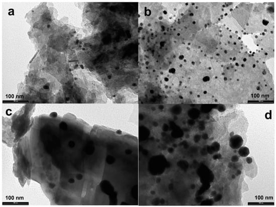 To better highlight the shape and size, TEM analyses (Figure 5) were performed. The TEM images showed the good distribution on the OMP surface and the spherical shape of the silver-based nanoparticles; moreover, the average size is in agreement with that found by the Scherrer equation.