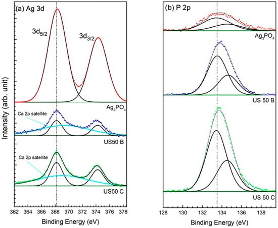 XPS spectra of the Ag 3d (a) and P 2p (b) regions of US50C, US50B, and the Ag3PO4 sample reference. The BE position of the main peaks is indicated by a dotted line.