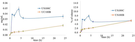 In order to explain the different antimicrobial activities between the composites obtained in the presence of citrate and those obtained in the presence of NaBH4 reduction, a silver in vitro release test was performed for the US100B and US100C composites, and the results are reported in Figure 7.