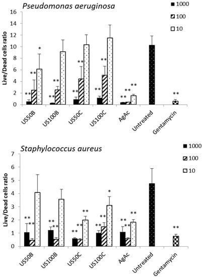 Live/dead ratio of Pseudomonas aeruginosa and Staphylococcus aureus biofilm cells after 24 h of incubation with 10, 100, and 1000 µg/L of the composites. Two independent experiments were performed in quadruplicate, and the data were reported as mean ± SD. A t-test was used for the statistical analysis of the raw data; * p < 0.05 and ** p < 0.01 (composite-treated or gentamycin-treated bacteria vs. untreated cells).