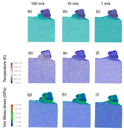 MD results for the cutting process, taken at a cut distance of 7 nm in the unlubricated case, as a function of velocity (each column refers to the value reported on top). Panels (a–c) report simulation snapshots, panels (d–f) temperature maps, and panels (g–i) Von Mises stress maps.