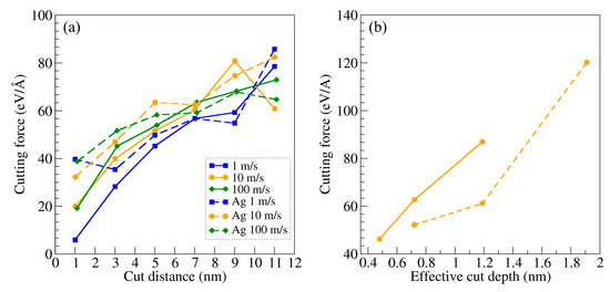 The cutting force Fc evaluation is important to assess the lubricating effect of Ag. In Figure 4a, we report on the calculations for lubricated and unlubricated cuts and for all the cutting speeds considered to date. There are no significant differences between the curves, with a steady increasing trend as the cutting proceeds. At the highest cutting speed, the curve is smoother when compared with the others. This erratic behavior in cutting force at lower speeds might be due to the fact that plastic rearrangements and material accumulation occur in front of the cutting tool, locally altering the mechanical properties of the workpiece. Furthermore, the tool itself undergoes significant deformations and shows a large degree of adhesion with the workpiece, implying that a stationarity of the cutting force is unlikely to be reached, unlike as expected for different simulation setups [60]. This effect is particularly evident for the slowest cutting speed of 1 m/s, for which we observe a large accumulation of Ti in front of the tip and larger tool wear. As it can be appreciated in Figure 3, the effective cut depth is significantly larger in the case of Ag lubrication. This indicates that, even if Fc is the same for lubricated and unlubricated cutting, the lubricated cutting is significantly more effective, thereby confirming the lubricating capability of Ag. To further validate this observation, we performed lubricated and unlubricated cutting simulations at the cutting speed of 10 m/s for different initial cut depths, i.e., 1.1 and 2.5 nm, and calculated Fc at a cut distance of 7 nm as a function of the effective cut depth, which was considered as the average distance between the already cut and initial Ti surface. Results are reported in Figure 4b. In both lubricated and unlubricated processes, Fc increases with the effective cut depth, as expected [36,60]. Regarding Ag, it is confirmed to improve the cutting process by enabling a larger cut depth.