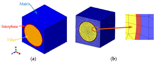 To consider the interphases in the composites, the RVE model with interphases around the fibers is established. The thickness of the interphase is set to be 500 nm [33]. In [33], the material parameters of the interphase are set to be homogenized. The elastic modulus is set to be 1.9 GPa. This elastic modulus value is adopted in this study as a reference. The Poisson’s ratio of the interphase is assumed to be same as that of matrix. The approximate mesh size for the RVE is set to 0.4 in ABAQUS (Figure 1b). The mesh type for the fiber and matrix contains both C3D8R and C3D6 elements. For the interphase, only the C3D8R element is used.