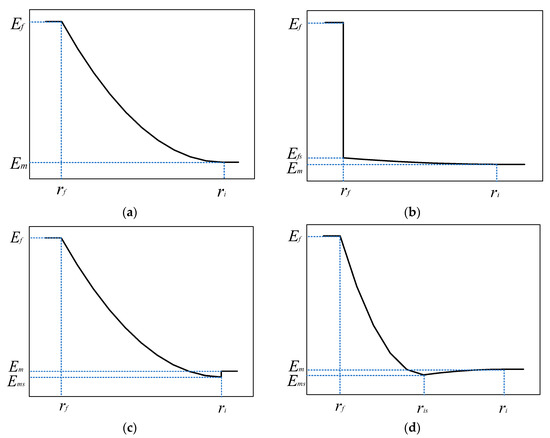 If the elastic modulus values in the interphase are heterogeneous, the typical elastic modulus distribution patterns from the fiber to the matrix can be expressed as exponential variation (Equations (1)–(3)) [34]. Four different elastic modulus distribution patterns within the interphase will be considered in this study. For case 1, shown in Figure 2a, the lowest elastic modulus’s location is at the interphase’s boundary, and the lowest elastic modulus value is the matrix’s elastic modulus. For case 2 (α = 0.1), the fiber interface bond strength is weak, and the elastic modulus at the fiber boundary is set to be a very small value, which corresponds to Figure 2b. For case 3 (β = 0.1), the matrix solidification is not good and fiber bonding is perfect. The corresponding elastic distribution patterns are shown in Figure 2c. For the last case (β = 0.1, γ = 0.5), the illustration is shown in Figure 2d. It can be observed that the elastic modulus firstly decreases from the fiber’s boundary to the lowest boundary and gradually increases to the interphase’s boundary.
