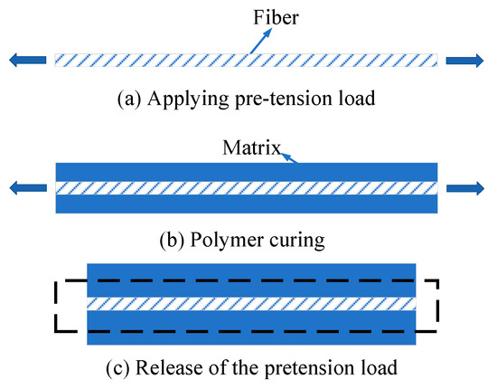 Prestressed composites have been developed and widely used in civil engineering [1,2]. The properties of composites are believed to be dependent on the residual stress and internal structures, which are induced by the manufacturing process. The existence of residual stress is critical for the damage initiation, damage evolution, and strength values of composites [3,4,5,6]. Thus, it is necessary to reveal the changes of residual stress distribution patterns in prestressed composites. For the prestressed composites, the manufacturing process is composed of preload application, a polymer curing process, and a preload release process [6,7,8,9,10]. Thus, the residual stress of prestressed composite is composed of not only the thermal residual stress (TRS) induced by polymer curing, but also the residual stress induced by the prestress application process.