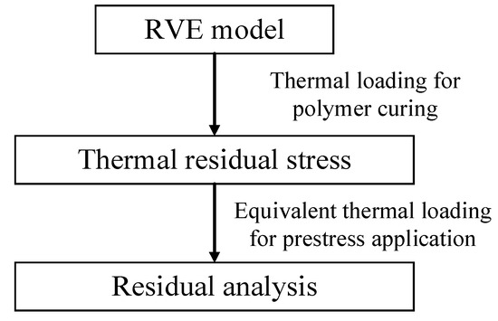 To obtain the residual stress distribution patterns of prestressed composites with FEM considering both polymer curing and prestress application, a multi-step methodology based on the manufacturing processes is developed here (Figure 5). Firstly, the TRS analysis considering the polymer curing is conducted based on the difference between curing temperature and room temperature. Then, the thermal residual stress values are set as the initial stress states for the RVE model. Thereafter, the transverse CTE of the fiber is set in the RVE and the equivalent temperature loading is calculated based on the prestress value, longitudinal CTE, and elastic modulus of the fiber. Finally, the residual stress states of the prestressed composites can be obtained. All the numerical analyses are conducted with the commercial software Abaqus/Standard 6.14. Due to the consideration of the transverse expansion of fibers based on the multi-step methodology, the developed numerical method should be available for the other kinds of fiber-reinforced composites.