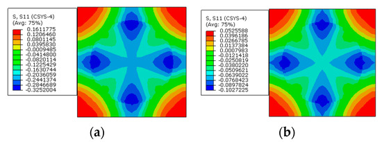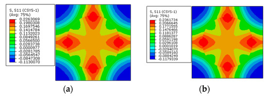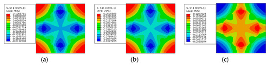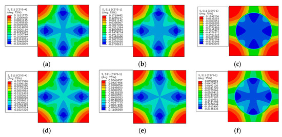 The numerical methods for prestress application are first verified here, which means that polymer curing is not considered. With the first prestress application method, the longitudinal stress distribution patterns of the RVE after applying prestress are shown in Figure 6a. It can be found that after the release of pretension load, the matrix is in a compression state and the fiber is still in a tension state along the fiber direction. From the transverse strain distribution patterns of the fiber (Figure 7a), it can be found that the fiber expands along the transverse direction.