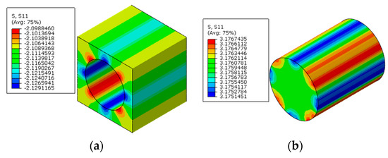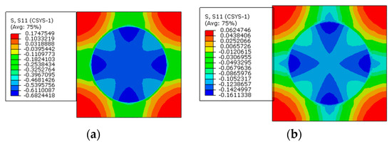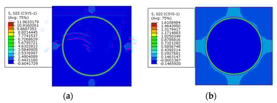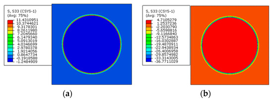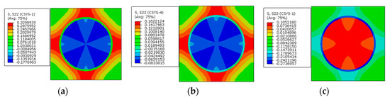 To apply the designed prestress with the second prestress application method, the equivalent temperature loading applied to the fibers is first calculated as 165.5 °C, based on the longitudinal CTE of fiber. Then, based on the transverse strain values of the fiber predicted with the first method, the equivalent transverse CTE of the fiber for prestress application is calculated as −9.5 × 10−7/°C. Finally, with the longitudinal and equivalent transverse CTEs of the fiber, the stress distribution patterns calculated with the modified equivalent thermal method are shown in Figure 6b. The stress values in the fiber and matrix are almost the same as those obtained with the first method. However, there is a little difference between the predicted transverse strain values of the fibers (Figure 7a,b), which should be attributed to the calculation error induced during the calculation of the equivalent transverse CTE of the fiber. From the analytical method developed in [27], the axial stress values in the matrix and fiber are calculated as −2.5 MPa and 3.8 MPa, respectively. The values are very close with those predicted with FEM (Table 2), which demonstrates the effectiveness of the prestress application methods. Furthermore, the radial and circumferential stress distribution patterns in the RVE are shown in Figure 8 and Figure 9 with different prestress application methods. The consistency between the stress distribution patterns also demonstrates the effectiveness of the prestress application method. As the modified equivalent thermal method is more convenient than the first method, the equivalent thermal method will be adopted for the analyses blow.