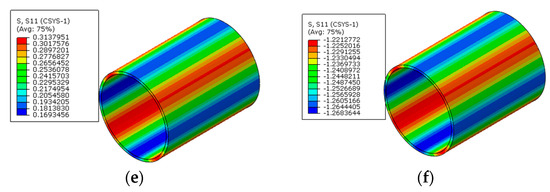 Residual axial stress distribution patterns in the RVE considering interphase (a) in the matrix before applying prestress; (b) in the matrix after applying prestress; (c) in the fiber before applying prestress; (d) in the fiber after applying prestress; (e) in the interphase before applying prestress; (f) in the interphase after applying prestress.