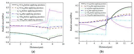 The radial stress distribution patterns of the models without and with applying prestress are shown in Figure 18. It can be observed that the tensile and compressive stress concentration regions are changed due to the increase in the interphase’s CTE. However, compared with the effects of prestress level, the stress concentration region still remains within the corresponding constituent. With the application of prestress, it can be observed that except the condition αi = αm, the stress distribution patterns are changed by the prestress applied.