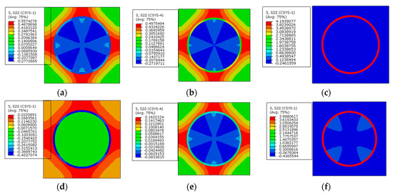 Circumferential stress distribution patterns. (a) Ei = 1.9 GPa without prestress; (b) Ei = 5 GPa without prestress; (c) Ei = 50 GPa without prestress; (d) Ei = 1.9 GPa with prestress; (e) Ei = 5 GPa with prestress; (f) Ei = 50 GPa with prestress.