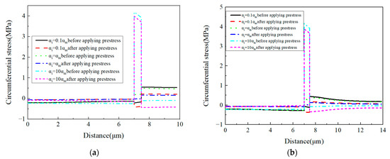Along the circumferential direction (Figure 20), with the increase in the CTE of the interphase, the tensile stress concentration region changes from the matrix to the interphase. The application of designed prestress reduces the tensile stress concentration value in the RVE. Similar to the radial stress distribution patterns, it can be observed that except the condition αi = αm, the stress distribution patterns are changed by applying prestress.