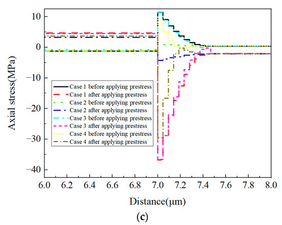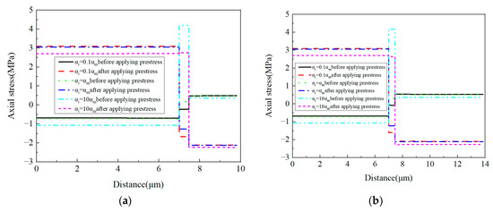 From the axial stress distribution patterns (Figure 28), it can be observed that the stress in one constituent is also almost uniform. With the increase in the interphase’s elastic modulus, the tensile stress value in the interphase increases with only thermal loading applied. After considering prestress, the stress in the interphase changes from the tensile state to the compressive state and the stress values also increase with the increase in the elastic modulus. The fiber is put in a tensile state after applying prestress and the tensile stress value becomes larger and larger with the increase in the interphase elastic modulus.