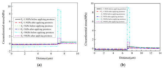 The circumferential stress values along path-1 and path-2 are shown in Figure 27. With the increase in the elastic modulus of the interphase, the tensile circumferential stress in the interphase become larger under thermal loading. After applying the designed prestress, the differences between the stress values of the fiber and interphase become less. The reduction degree is much larger than the reduction induced by applying prestress on the models with different interphase CTE. It can also be observed that the elastic modulus of the interphase has little influence on the circumferential stress of the matrix. Compared with the values along path-1, the stress decreases along path-2 in the matrix regions, which is similar to the pattern shown in Figure 21.