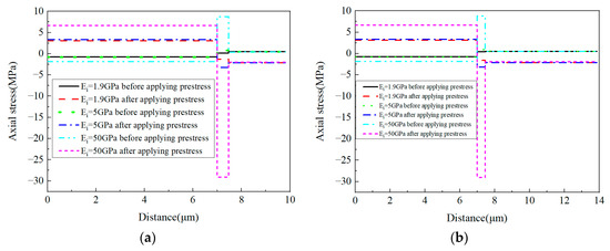 With different interphase elastic modulus values, the axial stress values along path-1 and path-2 are shown in Figure 29. It can be observed that the elastic modulus of the interphase also has little influence on the matrix axial stress values. However, it has huge influences on the stress values of the fiber and the interphase. This is similar to the conclusion obtained in [15], which should be attributed to the small volume fraction of the interphase and smaller elastic modulus of the matrix compared with that of the fiber. With the increase in the elastic modulus, both the compressive stress in the fiber and the tensile stress in the interphase increase. The axial stress values along path-1 and path-2 are very similar to each other. After applying prestress, the difference between the stress values in the fiber and the interphase increase with the increase in the interphase’s elastic modulus. The axial stress in the RVE is different from the radial and circumferential stress values, because the prestress enlarges the stress differences between the fiber and the interphase.