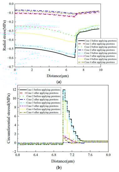 Stress distribution patterns along the radial direction (a) before applying prestress and (b) after applying prestress.