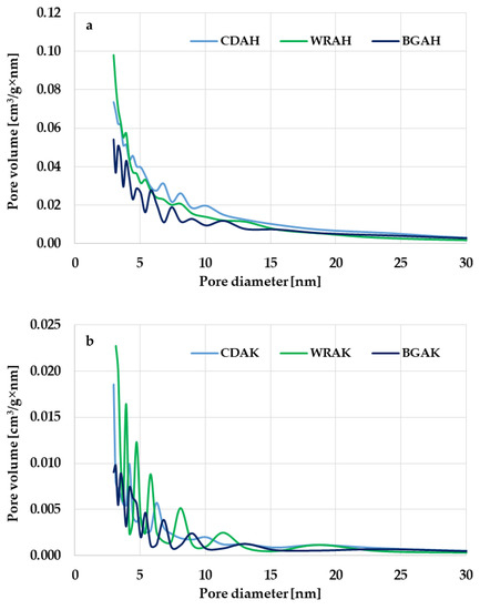 Based on the analysis of the data presented in Table 3, it can be concluded that the heat treatment of expired or broken food products in the presence of potassium carbonate or orthophosphoric acid leads to activated carbons with a micro-mesoporous structure. The micropore contribution to the total pore volume depends, first of all, on the type of the activating agent. The influence of the precursor type is less pronounced. The greatest contribution of micropores of 69% is found in the WRAK sample obtained by the chemical activation of waste white rice with K2CO3. In the case of the second activated carbon obtained from the same precursor but via the activation with H3PO4 (WRAH sample), the proportion of micropores is smaller by 17%. The same dependency is observed for the other precursors. Carbons obtained with the use of the basic activating agent are characterized by a significantly greater share of micropores in the structure than the analogous materials subjected to the thermal treatment in the presence of the activating agent of acidic character. The greatest difference in this respect (21%) was noted for the samples obtained from buckwheat groats. The confirmation of these observations is the course of the pore size distribution curves shown in Figure 1. The products of microwave-assisted chemical activation with H3PO4 have a great volume of pores with a diameter in the range of 2–25 nm, including small and medium mesopores (Figure 1a). In the case of the analogous activated carbons obtained via the chemical activation with potassium carbonate (Figure 1b), the pore volume is significantly smaller; however, the pore size distribution is much narrower and ranges from 2 to 15 nm.