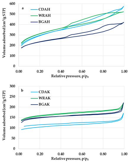 Significant differences between the porous structure of carbons activated with H3PO4 and K2CO3 are also confirmed by the courses of low-temperature nitrogen sorption isotherms presented in Figure 2. The shape of the N2 adsorption/desorption isotherms observed for the CDAH, WRAH, and BGAH samples (Figure 2a) is similar to the type IV according to the IUPAC classification. The characteristic and very broad hysteresis loop (close to the H4 type) indicates the presence of a significant amount of mesopores in the structure of the activated carbons prepared via activation with orthophosphoric acid. In turn, in the case of the corresponding samples activated with potassium carbonate, the shape of N2 sorption isotherms is similar to type I according to the IUPAC classification, which means that these carbonaceous materials contain considerable amounts of micropores and small mesopores in their structure.