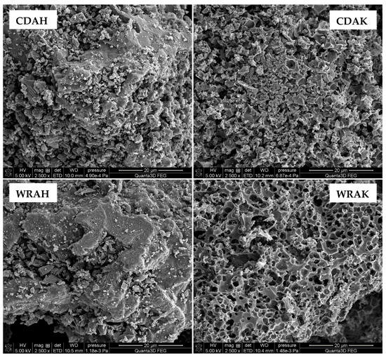 Textural and morphological diversities of individually activated carbons are also confirmed by the SEM images presented in Figure 3. Depending on the precursor type and the activation procedure, the samples differ significantly in terms of the number, shape, and size, as well as the arrangement of pores, holes, and slits. These differences are particularly well seen for the samples obtained by the microwave-assisted chemical activation of white rice grains. In the case of the sample activated with potassium carbonate (WRAK), numerous pores of various diameters and almost circular shapes are observed. In addition, many of these pores are interconnected. In the case of the carbonaceous material activated with orthophosphoric acid, the number of pores is smaller, whereas their diameter is considerably larger. Unfortunately, a significant part of the pores is blocked by small particles, which can be both very small pieces of activated carbon grains (carbon dust) and the mineral substance (ash)—the brighter fragments observed in the SEM images. In the case of the analogous materials obtained via the chemical activation of the solid residue of the “cola-type” drink, the situation is quite similar.