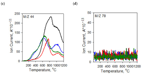 MS profiles of gaseous products of the activated carbons structure defragmentation: (a) m/z 18 (H2O; (b) m/z 28 (CO); (c) m/z 44 (CO2); (d) m/z 78 (C6H6) obtained in the helium atmosphere.