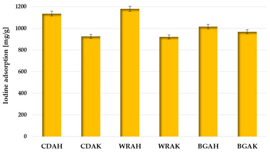 In order to test the sorption abilities of the obtained activated carbons and assess their usefulness for the removal of impurities with a small molecule size from the liquid phase, the iodine number was determined. According to the data presented in Figure 6, carbon materials obtained as a result of activation with orthophosphoric acid are much better in terms of iodine adsorption. This is particularly visible for the WRAH and WRAK samples obtained from white rice grains, where the difference in the sorption capacity is as great as 259 mg/g.