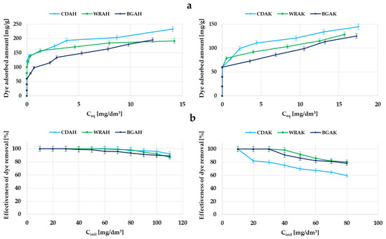 As follows from the analysis of the data presented in Figure 7b, the majority of the samples activated with H3PO4 show 100% efficiency in the methylene blue removal in a wide range of its initial concentrations, i.e., from 10 to 60 mg/dm3. Importantly, even at concentrations of the order of 110 mg/dm3, the adsorption efficiency is very great and reaches about 90%. Unfortunately, in the case of the analogous materials activated with K2CO3 (in particular, the CDAK sample), the efficiency of synthetic thiazine dye removal from the aqueous solution is definitely smaller.