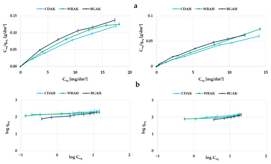 In order to determine the mechanism of dye molecule interactions with the obtained carbon adsorbents, the experimental data were analyzed using two popular models of adsorption—the Langmuir and Freundlich ones. The data summarized in Table 5 show that for all the activated carbons, the higher values of the correlation coefficient were obtained for the Langmuir model. This fact indicates that the methylene blue adsorption most probably proceeds with the formation of the adsorbate monolayer on the surface of the tested adsorbents. This is especially evident for the CDAH and WRAH samples, for which the value of determination coefficient R2 is close to 1. However, in the case of the WRAH and BGAH samples, equally high values of R2 were obtained for the Freundlich model; therefore, a slightly more complicated mechanism of adsorption—i.e., with the formation of a multilayer of adsorbate molecules on the surface of the obtained activated carbons—cannot be ruled out.