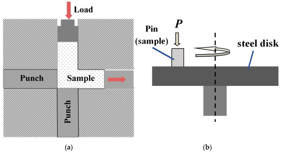 Sample processing scheme in the die for ECAP (a) and scheme pin-on-disk of the wear tests (b).