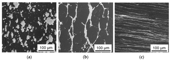 It can be seen from the presented images that the macrostructure of the Al-30Sn alloy after two passes with route C remains coarse-grained (Figure 6b), while the structure of the material becomes layered in the material flow plane after two passes by ECAP-A (Figure 6a). If a flow plane of the material with such a layered structure is used as a friction surface, the distance between Sn inclusions which are sources of solid lubricant will be much smaller than that in the initial sintered material (Figure 2b) or sample after ECAP with route C. It was found in [30] that the processing of Al-Sn alloys by ECAP-C is less effective in increasing their wear resistance than ECAP-A. Perhaps the reason for this lies in the different distances between the Sn interlayers, which act as sources of solid lubricant and can be smeared on the friction surface in the sliding direction.