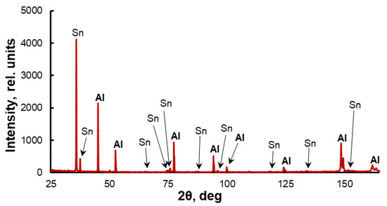 Al and Sn are mutually insoluble in the solid state and do not affect the mechanical properties of each other. That is, the strength of sintered Al-Sn alloys is an additive value and is determined by their volumetric phase ratio. Tin is not hardened during deformation, and the strength of the deformed two-phase Al-Sn alloys depends only on the strain hardening degree of the Al grains [14]. The strength of the alloys can be additionally increased by using a solid solution [18,19,20] or dispersion [21,22,23] hardening of the aluminum matrix. However, in this case, it is necessary to avoid the presence of the alloying elements in Sn and, as a consequence, the deterioration of its lubricating properties [24].