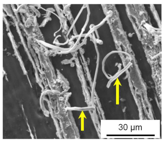 The maximum increase in the wear resistance of Al-Sn composites with a high tin content is achieved after two passes by ECAP with both of the above-mentioned routes [30]. A further increase in the number of ECAP passes does not lead to an increase in the wear resistance of the composites and even decreases it, despite the fact that thinning of the phases’ interlayers continues in the case of route A [15]. Apparently, thinning of the Sn interlayers and, as a result, an increase in the area of the interfacial surface, which is harder than tin, do not allow increasing the volume of the solid lubricant extruded on the friction surface. In addition, a significant thinning of the Sn interlayers can lead to a sharp decrease in their plasticity resource or the formation of discontinuities at their boundary with the aluminum matrix, which can also affect the value of Ih. Examples of interfacial separations can be seen in Figure 2c and Figure 7.
