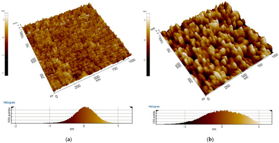 AFM analysis is considered next. The topography of the deposited layers was investigated by AFM and presented in Figure 1 and Figure 2. Based on obtained In2O3 and ITO results, it was found that the layers with the most negligible thickness have a finer-crystalline structure than the layers with the most significant thickness. The results showed that ITO and In2O3 thin layers have a crystalline structure with a domain that increases in size with increasing thickness. Grown layers’ completeness depends on the quality of interfaces, which in turn depends on the number of properties, such as crystal structure and defects existing in a thin layer. Parameters, such as thickness, doping type, level, and other deposited conditions, should be optimized to optimize electrical parameters—for instance, the potential of the contact layer, low electrical resistance, as well optical parameters such as high transparency [30]. The roughness measurements showed an increase in In2O3 and ITO roughness with the layer thickness (Table 4).