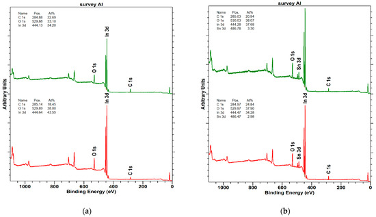 Figure 3. Survey spectra of (a) In2O3, (b) ITO sample surfaces (where: at the bottom −25 nm, at the top 135 nm).