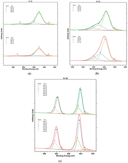 The deconvolution of C 1s spectra shows four spectrum components, where the one at lowest electron binding energy (BE) of app. 283 eV is assigned to carbon–metal bonding (Figure 4a). The amount of carbon–metal bonds increases with the layer thickness. This suggests the presence of carbide species at the surface of deposited layers and supports the conclusion that these species result from the target composition, i.e., from bonding agent of In2O3 powder in the target body. The O 1s spectra acquired at both studied surfaces show the presence of oxygen vacancies (component A) (Figure 4b). The amount of vacancies increases with the layer thickness, which suggests that the vacuum conditions applied during the deposition process have an impact on vacancy formation. On the other hand, the main surface component is still a lattice oxide, as indicated by B component of O 1s spectra. Based on the analysis of In 3d (Figure 4c), where the spectrum shows three doublet components, it can be stated that the main surface component is oxide. The surfaces of In2O3 contain hydroxyl groups (component C), which is in good agreement with O 1s spectra.
