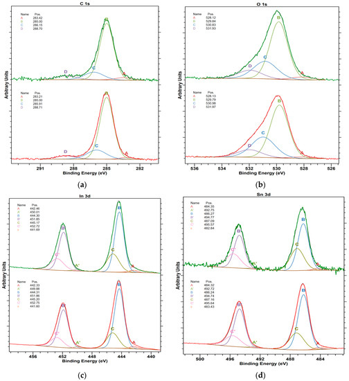 Figure 5. High-resolution XP spectra of ITO layers (a) C 1s (A: C-metal; carbon-metal bonding, carbides, B: C-C; organic carbon, the BE suggests that it can be sp2 in the majority, C: C-O; alcohol or ether groups, D: COOH, carboxylic or peptide groups), (b) O 1s (A: O-metal, defected oxide structure, presence of oxygen vacancies, B: O-metal, lattice oxides, C: OH, hydroxyl groups at the surface, D: O-C + H2O, organic compounds and water, oxygen bonded to short aliphatic chains + adsorbed water), (c) In three dimensions (A: In-C; surface carbides, B: In3+-O; In2O3 lattice oxide, C: In3+-OH; In(OH)3, (d) Sn 3d spectra of 25 nm ITO (bottom) and 135 nm ITO (top) sample surfaces (A: Sn-C, tin carbides, B: Sn4+-O; SnO2, C: Sn4+-OH; Sn(OH)4).