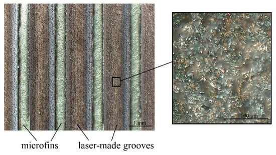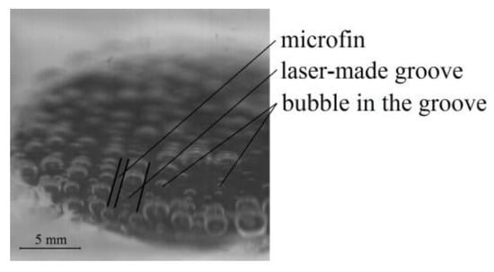 Figure 16 confirms this claim. It presents the laser-processed sample with a 0.4 mm groove depth and 1.5 mm groove width. The vapor bubbles line up along the microfins and are typically present at the bottom of the laser-made grooves due to their increased roughness.