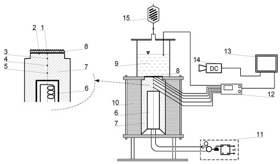 42], together with error analysis and calibration data (as an open access paper). The main element of the experimental set-up is the copper heating block with an electric resistance heater inside it, on which laser-treated samples were soldiered. Above the sample, a glass vessel with a boiling agent (water or ethanol) is located (