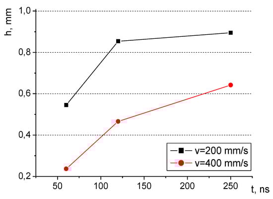 However, the relation between the pulse duration (t) and the obtained groove depth (h) for both scanning velocity (v) values is not linear, as presented in