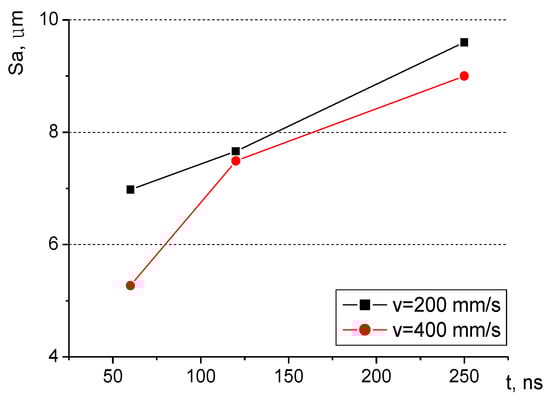 Figure 13 presents the dependence of surface roughness on the pulse duration values for two scanning velocities.