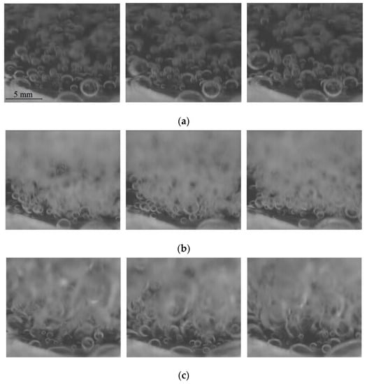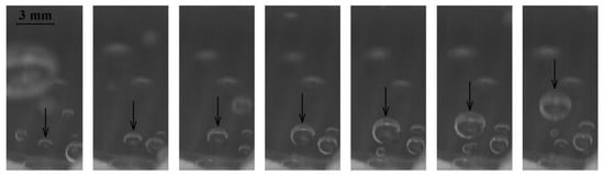Figure 18 presents a phenomenon of vapor bubble development until its departure. It seems that the bubbles are created at the most favorable locations (e.g., nucleation sites in the form of cavities on the rough laser-made surface) and the new bubble grows at the same location where the previous bubble (that already left the surface) developed—as seen in the figure.