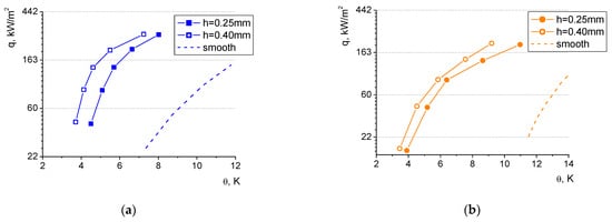 Figure 19) can be several times higher than those dissipated from a smooth surface (for both the boiling agents). The difference is particularly evident for low superheats, however, in this region, the comparison might be impossible due to the fact that boiling on the smooth surface is not even initiated at low superheats, and heat transfer occurs via convection without a change of phase.