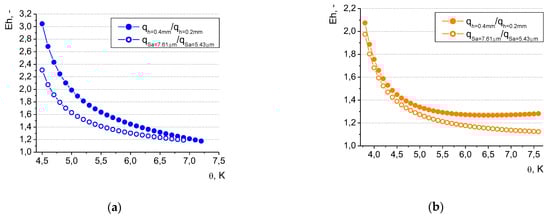 The analysis of the above figures indicates that the most significant improvement related to the use of higher microfins and rougher heaters occurs at low superheats. The heat flux dissipated from the longer microfins (of 0.4 mm) was over three times higher in comparison to the heat flux from the microfins of 0.2 mm—for water at the superheat of 4.5 K. In the case of ethanol, lower enhancement ratios were observed (namely, Eh = 1.45 for the same superheat of 4.5 K). The influence of surface roughness was less pronounced than that of the microfin height, however of the same nature. At the superheat of 4.5 K and in the case of water, the heat flux dissipated from the rougher surface (Sa = 7.61 μm) was ca. 2.3 times larger than that from the surface of 5.43 μm; while for ethanol, the improvement in the heat flux was smaller—the enhancement ratio amounted to ca. 1.4.