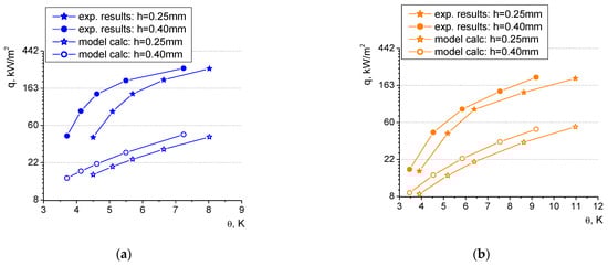 As can be seen, the model underestimates the values of heat flux (especially in the case of water). For example, the actual values of water boiling heat flux recorded at the superheat of 5.5 K during measurements on surfaces covered with 0.4 mm and 0.25 mm microfins were, respectively, 6.6 and 5.3 times higher than the calculation results obtained with the model. In the case of ethanol and the same superheat of 5.5 K, the discrepancies were lower and the respective values were 3.7 and 3.4. Generally, in the whole range of superheats, the experimental data were higher than the results of model calculations by 2.7–6.9 times for water and by 1.9–4.0 times for ethanol.