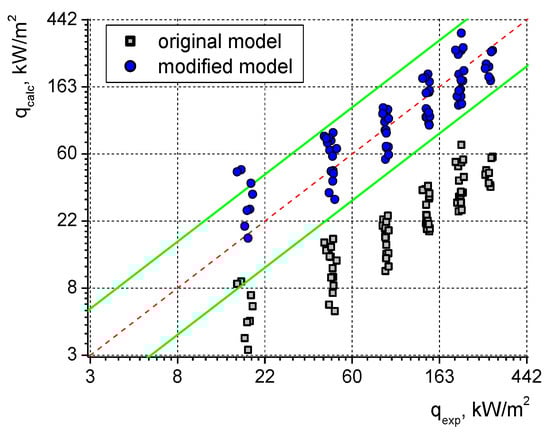 Figure 23 presents the comparison of the experimental and calculated values for the original and modified model. The red dashed lines indicate full agreement with the model (q