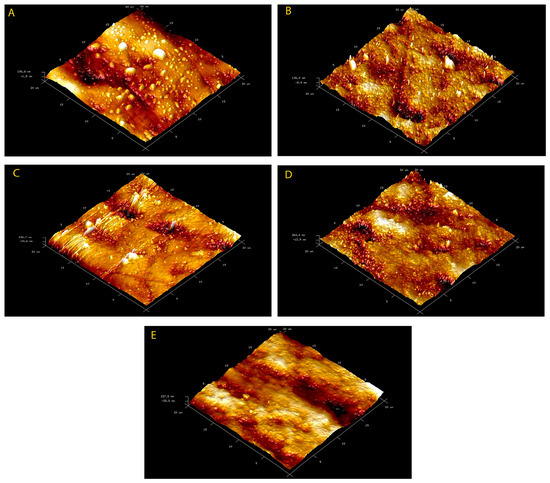 Following this, atomic force microscopy (AFM), which is a type of SPM with a high-resolution three-dimensional (3D) imaging technique, was used for the characterisation of surface roughness [19,21,22,23]. In addition to the 2D images, all samples were also scanned using the AFM’s silicon tip (OTESPA-R3, Bruker, Santa Barbara, CA 93117, USA) with the tapping mode to provide 3D images from the same area for the optimal topographic visualisation. The tapping mode of the AFM has the advantage of avoiding any surface dragging effects of the tip on the surface [19].